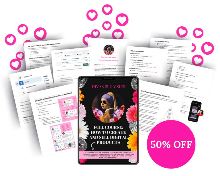 [HIGHLY RECOMMENDED] If you're serious about launching your digital product business, I strongly recommend adding the Full Digital Product Toolkit to your order. This bundle was created to save you dozens of hours of trial and error while you follow the course. Instead of starting everything from scratch, the toolkit gives you ready-to-use resources, planning tools, and content frameworks that help you move from idea → product → promotion much faster. If you feel overwhelmed by where to start, don’t want to spend weeks brainstorming ideas, want your products and visuals to look professional right away, want proven content ideas that attract buyers …then this toolkit will make the entire process significantly easier. Inside the toolkit you’ll get: Business Brainstorm Worksheets, List of Viral Digital Product Ideas, Done-For-You Canva Product Mockups, The Viral Content Vault, 2026 Business Planning Calendar. You can follow the course without these tools… but most people find it much easier and faster to build their business when they have everything organized and ready to use. Add the full Digital Product Toolkit below while your 55% discount is still active! Complete Toolkit Bundle [$57]
